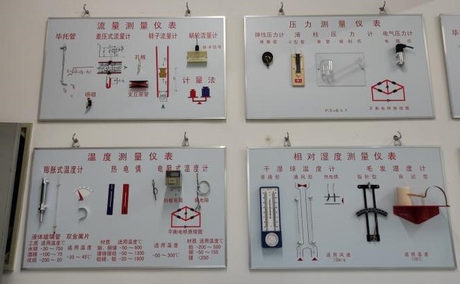 多種熱電偶等實(shí)物或模型組成,并在每類(lèi)儀表下面畫(huà)有材質(zhì)和使用適用溫度范圍的表格和工作原理圖