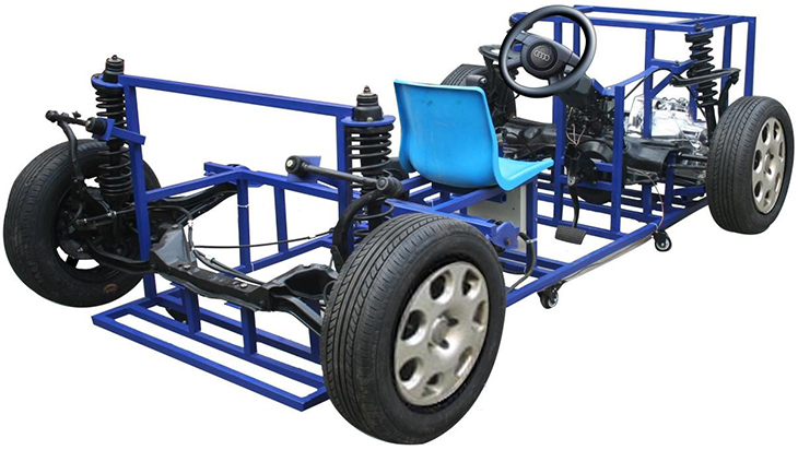 包括汽車前后懸掛系、轉向系、傳動系、手動變速器及掛檔機構、制動系等系統、安裝腳輪的可移動式臺架等組成。
