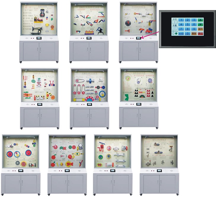 根據全國技工學校機械類通用教材《機械基礎》示教陳列柜是一套電化教學設備。本陳列柜共分十個柜,陳列柜通過機械模型或實物,配合相應的圖文資料,形象地展示與解說機械基礎的基本知識,加強學生對通用機械基礎的類型、結構特點及其設計的感性認知,為進一步學習機械基礎奠定基礎。